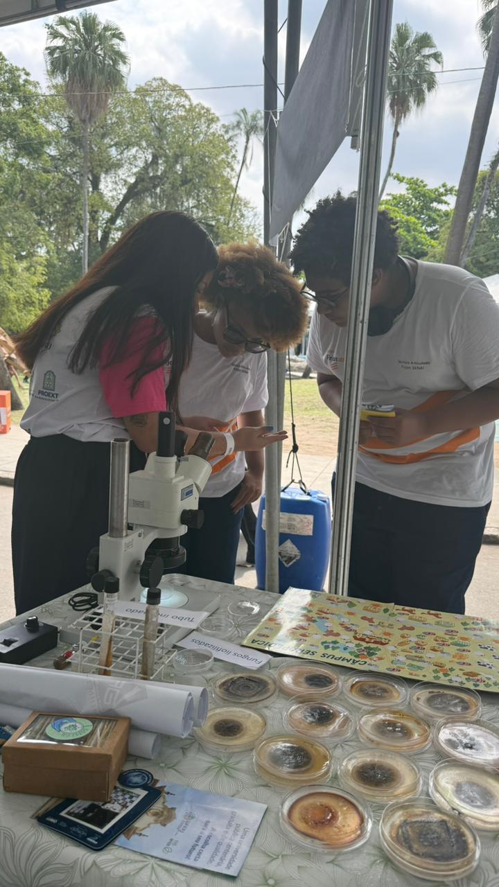 Com entrada gratuita e estrutura voltada à interação direta com o público, o Festival ofereceu atividades, oficinas, demonstrações científicas e espaços de diálogo, aproximando a sociedade de temas fundamentais para o futuro do planeta. Nesse contexto, representando o laboratório, a pós-graduanda Joana da Rocha Matos e a professora Isabele Ângelo estiveram presentes no dia 14, apresentando a Coleção de Culturas de Fungos Entomopatogênicos (CCFELCM) ao público. Durante a ação, as representantes do laboratório explicaram o papel dos fungos entomopatogênicos no controle biológico de insetos, destacando sua aplicação como alternativa sustentável ao uso de inseticidas químicos. A apresentação permitiu ao público conhecer de perto os processos de isolamento, preservação e estudo desses microrganismos, além de entender sua relevância na busca por soluções inovadoras e ambientalmente responsáveis.