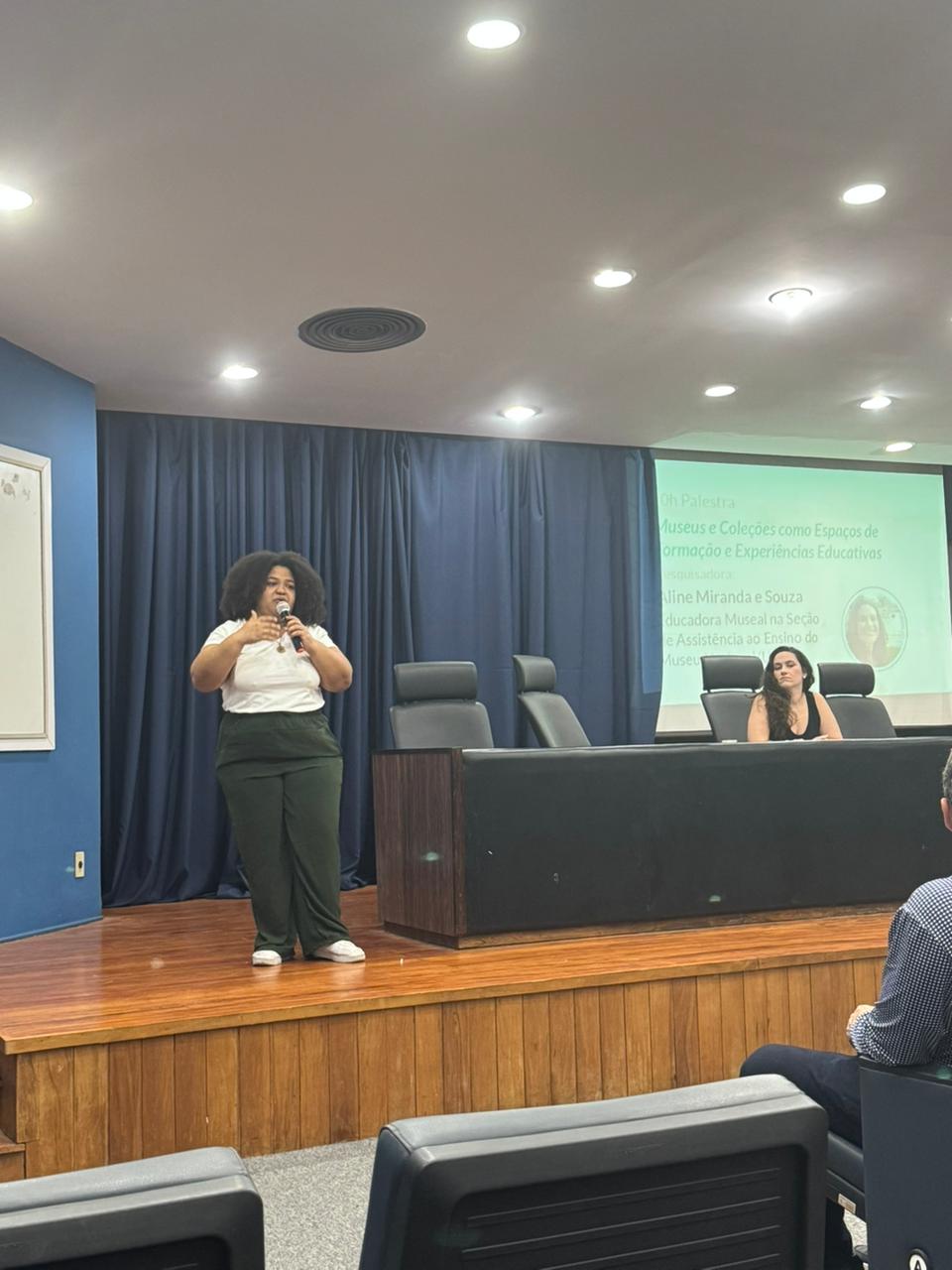 Em seguida, ocorreu a palestra “Museus e Coleções como Espaços de Formação e Experiências Educativas”, ministrada por Aline Miranda e Souza, educadora museal na Seção de Assistência ao Ensino do Museu Nacional/UFRJ, que destacou a importância das coleções como espaços de aprendizado e extensão universitária.