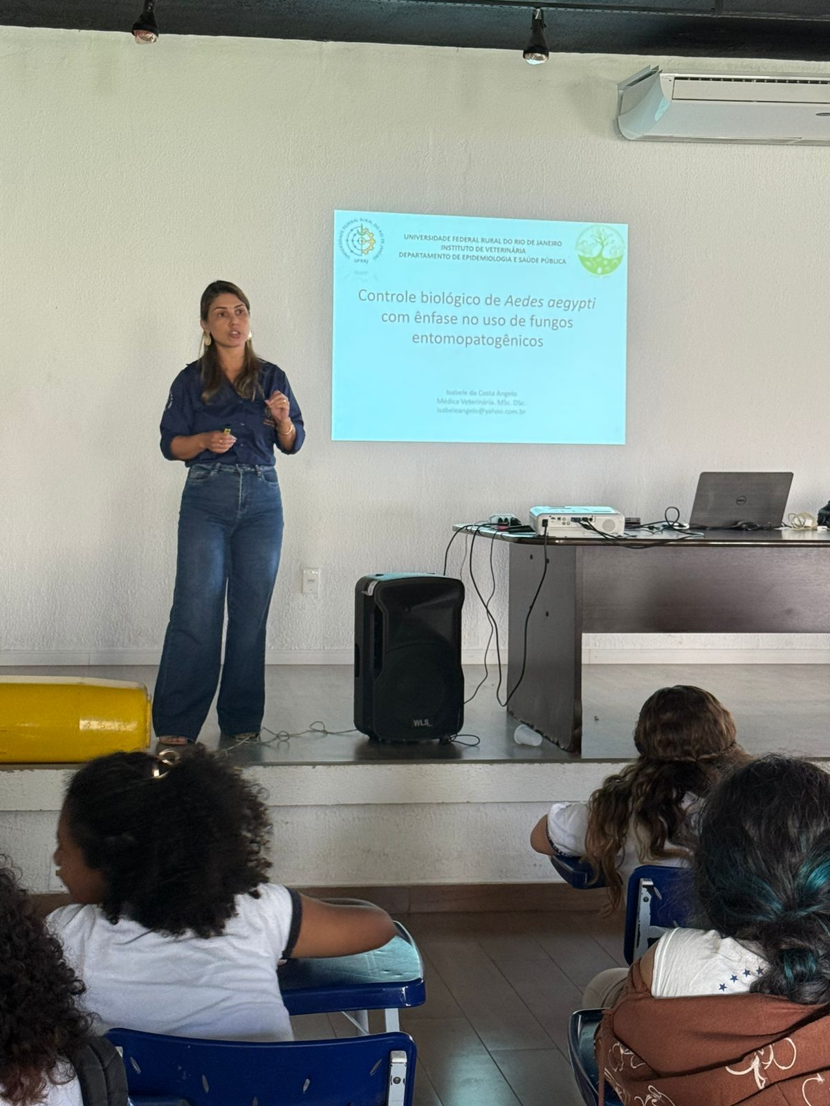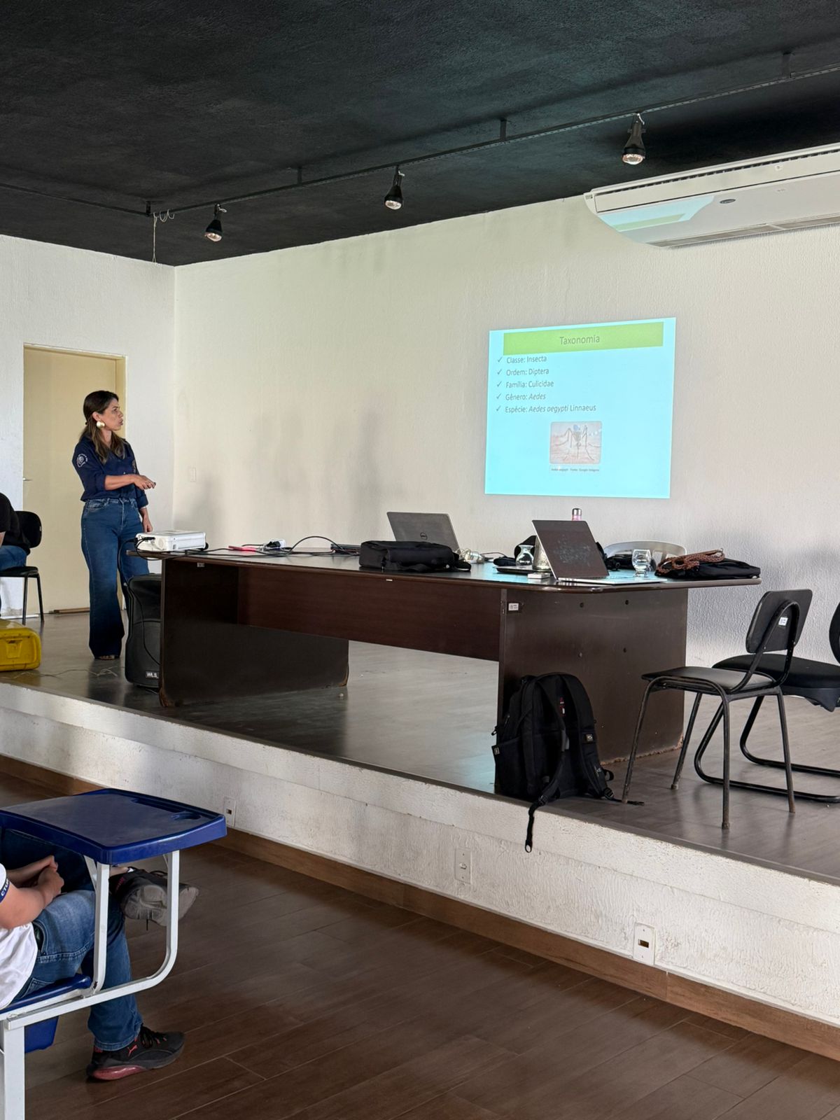 A palestra explorou o potencial dos fungos entomopatogênicos no combate ao mosquito vetor de arboviroses, abordando mecanismos de infecção, eficiência em diferentes estágios do inseto e perspectivas de aplicação desses microrganismos em programas de controle biológico sustentáveis.
